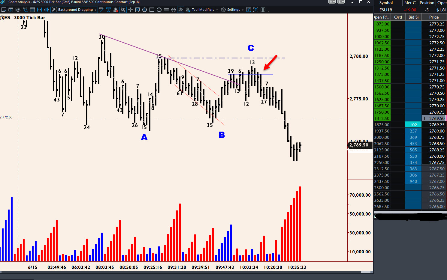 The market rallies into the 2777 – 2778 area (at C) and into the 10:00 AM timeframe, a time period which often sees reversals.