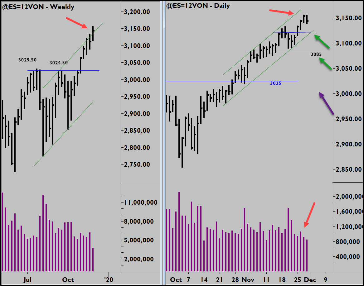As we come into holiday trading, the charts show that the market rally has hit a technically overbought condition. We see this on the weekly chart, with the S&Ps trading at the top of the weekly trend channel and supply line as it makes new, all-time highs, albeit on low volume.