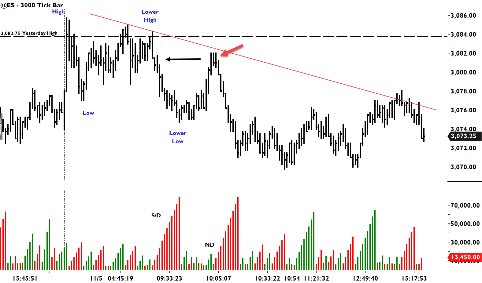 We find that short opportunity at 10:00 AM ET, a time period associated with morning turns in the S&Ps. We see the market rally up, and initially, price action looks constructive as closes become firm. But a quick look under the hood reveals the buyer’s problem: there is not much volume behind the move. We call this No Demand (ND). Just like the activity around yesterday’s high revealed weakness in the buyers, the volume on this rally shows buyers lack the strength needed to take the market up to new highs.